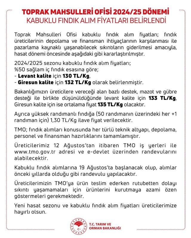 Toprak Mahsulleri Ofisi 2024 yılına ait fındık ürünün kilo başına alım tutarını açıklayarak uzun süredir üreticiler arasında merak konusu olan "fındık fiyatları ne olacak" sorusunun cevabını da böylece vermiş oldu.